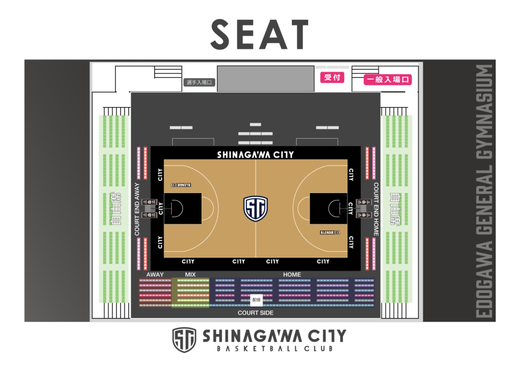 なお、「AWAY:AWAYチームグッズ着用可能エリア」「MIX:両チームグッズ着用可能エリア」「HOME:しながわシティバスケットボールクラブグッズ着用エリア」を設けさせていただきます。