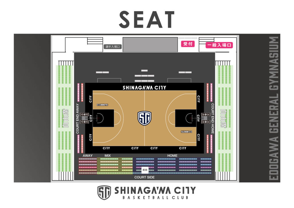 なお、「AWAY:AWAYチームグッズ着用可能エリア」「MIX:両チームグッズ着用可能エリア」「HOME:しながわシティバスケットボールクラブグッズ着用エリア」を設けさせていただきます。