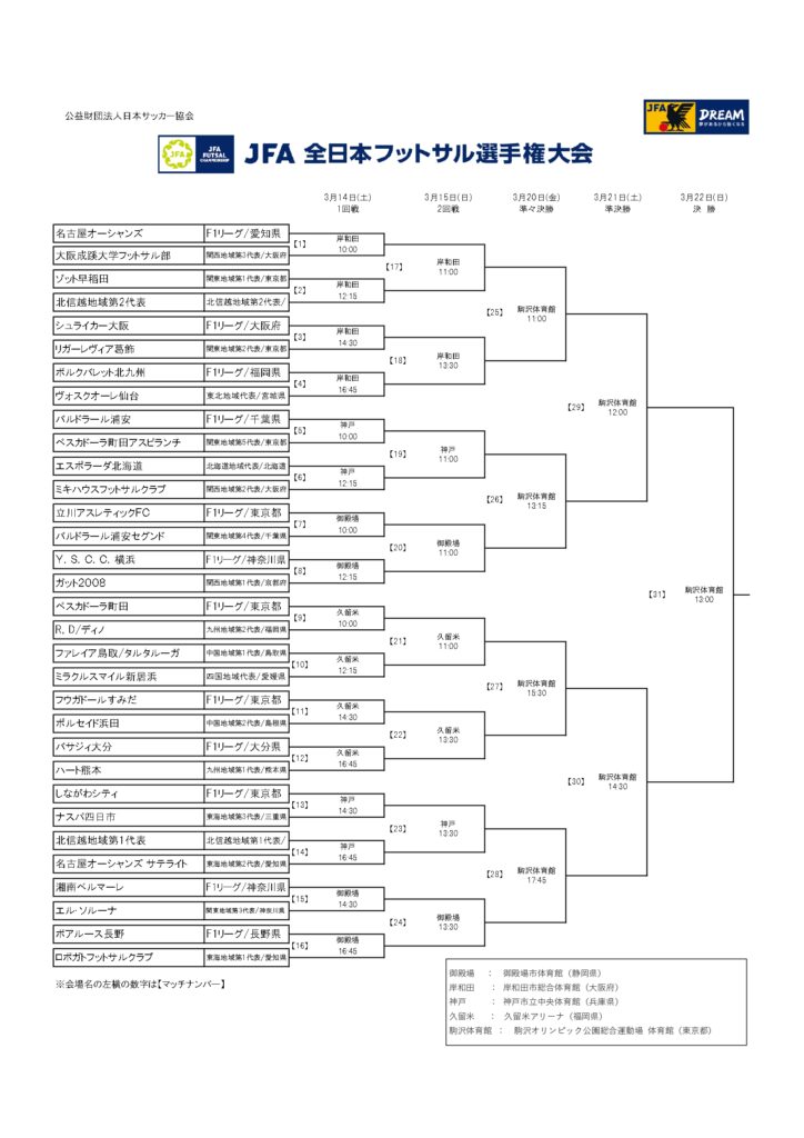 3月14日(土)より開催されます 『 JFA 第31回全日本フットサル選手権大会 』の組み合わせをお知らせいたします。
